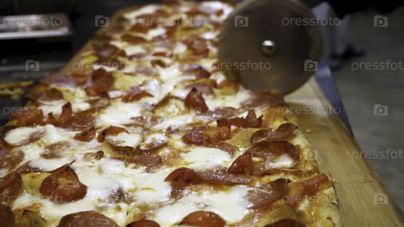 Покройте руки пекаря в черных кулинарных перчатках, режущего пиццу на кухне, вкусная итальянская концепция еды. Рамка. Человек разрезает свежеприготовленные ломтики пиццы специальным ножом