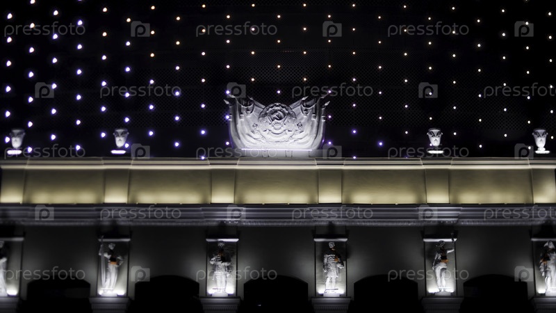 Ярко освещенный фасад советского здания ночью с символом Молот и серп. резервные кадры. Красивый экстерьер дома украшен мигающими огнями