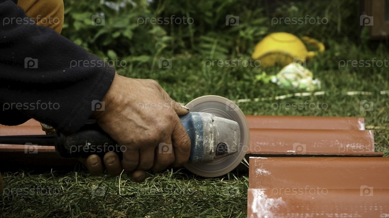Руфер с помощью угловой шлифовальной машины режет крышные плитки в красный цвет.Покрыть руки мужского работника, разрезающего кровельные плиты профессиональной пилы