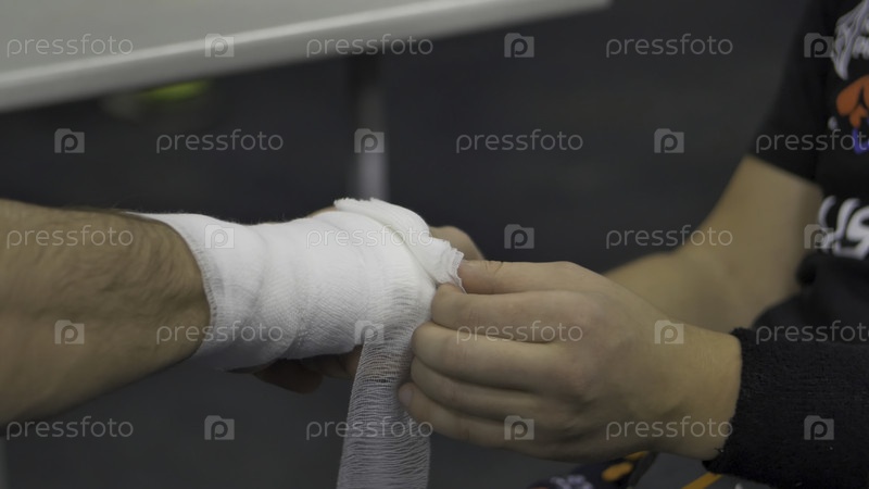 Профессиональный боец в раздевалке перед поединком надевает повязку на руку