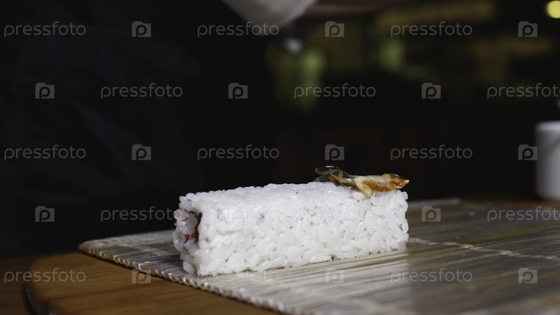 Приготовление рисовых рулонов с суши. рама. шеф-повар восточной кухни в перчатках готовит свитки с суши. повар положил куски угрей для суши