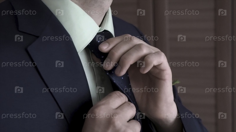 Портрет бизнесмена, настраивающего галстук стоя в офисе.Клип.Мужчина в черном костюме и белой рубашке выпрямляет галстук своими руками, крупный снимок безликий
