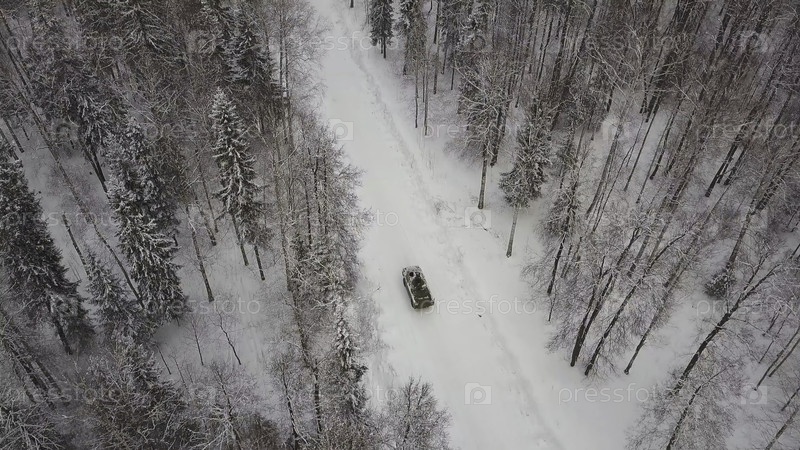 Вид с воздуха танка, проезжающего через зимний лес.Боевой танк в лесу.Танк на снегу
