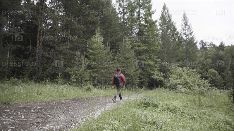 Пешеход в рюкзаке и красной куртке, идущий пешком по лесу.Молодой человек идет по открытой тропе вдоль леса