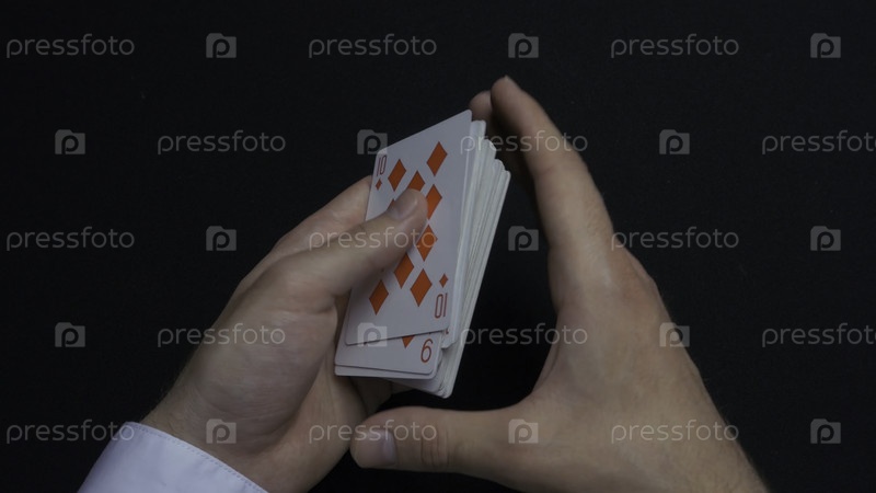 Играть в покер - это перемешивать карты. Руки мужчины смешивают карты. Закрывайте его. Руки мужчины смешивают игровые карточки. руки дилера смешивают карты во время игры в покер