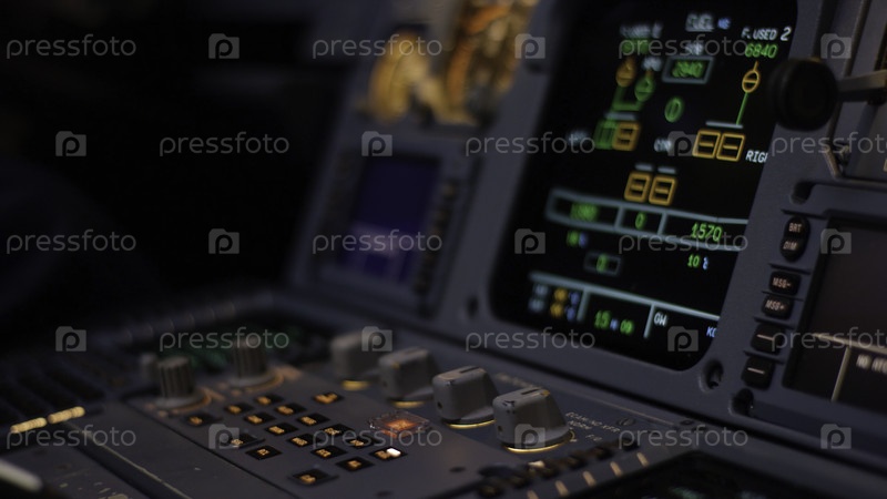Элемент управления автопилотом лайнера. Переключательная панель на пилотской палубе самолета. рычаги двухмоторного авиалайнера. Пилот управляет самолётом. Бортовый компьютер, кабина