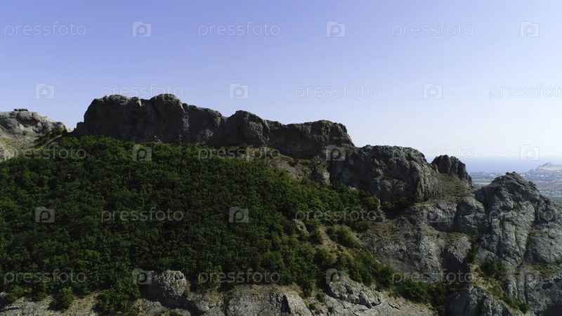 Вид с воздуха на залитые солнцем склоны красивого смешанного леса в свежих зеленых цветах лета.Концепция лесного хозяйства, природы и сезонов, удивительная горная вершина