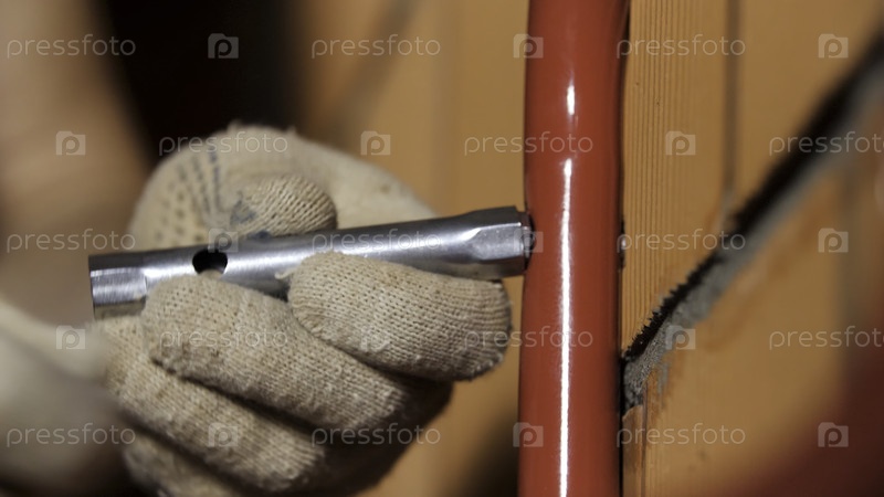 Близкий взгляд на рабочего-мужчину, использующего шестой ключ для стенной работы. резервные кадры. мастер пытается прикрепить металлические детали к стене из красного кирпича