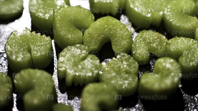 Раздробленный сельдерей, поджариваемый на черной сковороде, концепция здорового веганского питания. Резервные кадры. Закройте куски зеленой свежей сельдерии на жирном фоне поверхности сковородки