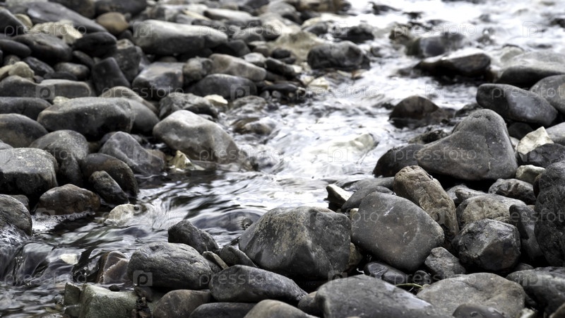 Речной поток течет через серые камни, быстрый и холодный поток с чистой водой протекает сквозь скалистую местность