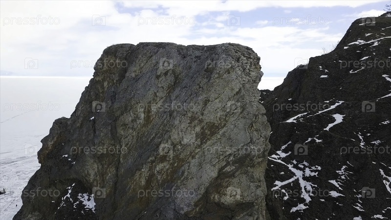 Замороженное озеро Байкал, живописный зимний пейзаж с бесконечной поверхностью шерсти и скалистым берегом