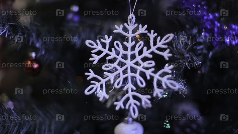 Рождественские игрушки на елке, такие как снежинки и красные шары. Новогодние украшения из мячей на ветке снега. Белая снежинка и синий рождественский шар. Выборочный фокус