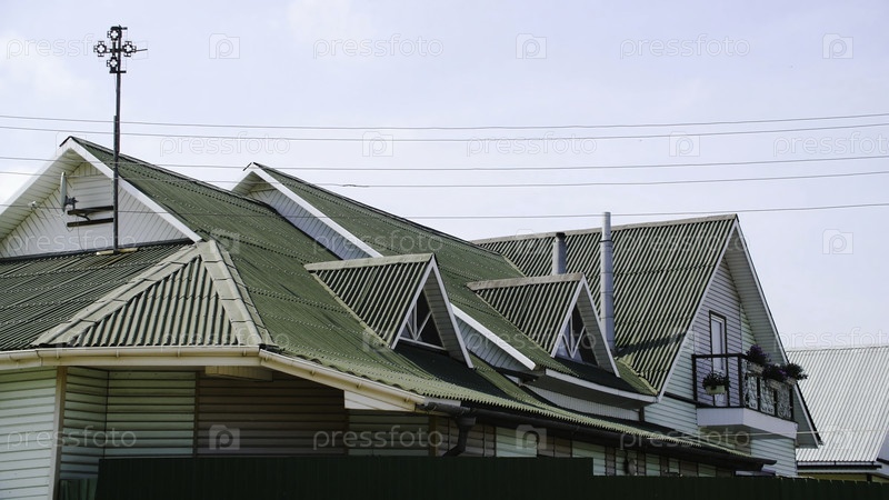 Зеленый кровельный покров. резервные кадры. Красивая зеленая крыша сделана из профилированного напольного покрытия. Новое крышечное покрытие загородного дома. Многослойная кровля с окнами на боках