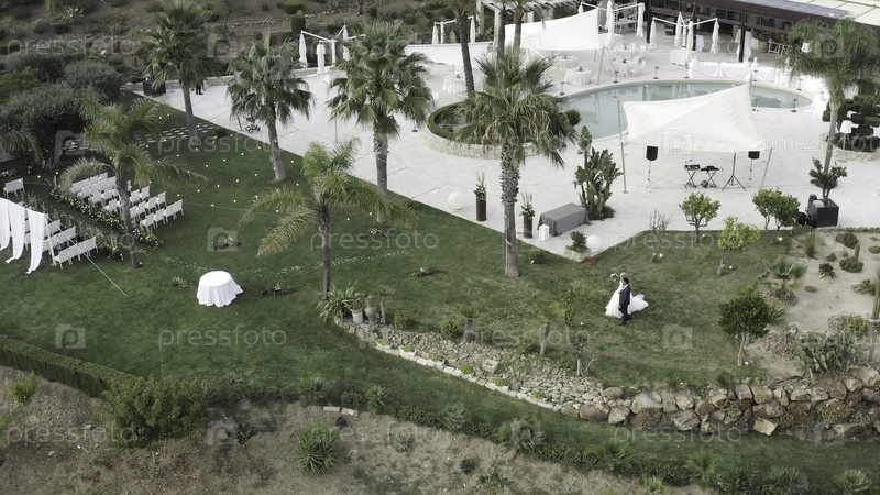 Вид с воздуха красивой невесты и жениха, гуляющих по зеленой лужайке рядом с роскошным отелем и пальмами на юге