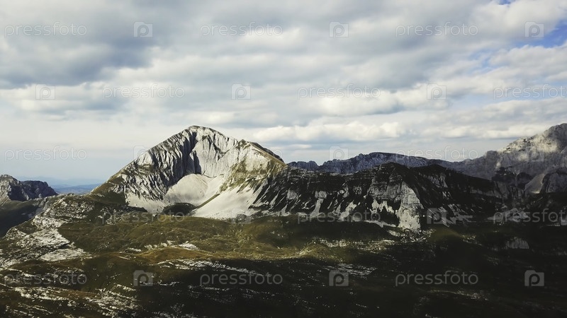 Вид на скалистую местность в зеленом цвете с камнем. Сток. Эрозия горных пород. Прекрасный вид на горы и природу. Горная панорама синего неба с облаками