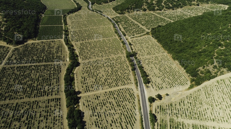 Вид с воздуха зеленого поля со многими рядами растущих растений возле узкой дороги и кустарников