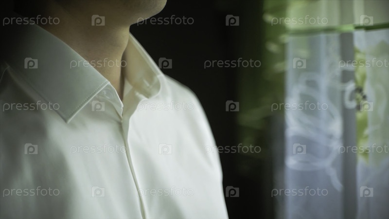 Мужчина застегнул белую рубашку, стоя перед ярким окном.Клип 'Люди, бизнес, мода и концепция одежды - покрытие мужчины путем переодевания и застегивания футболок дома'