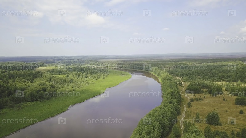 Красивый осенний пейзаж природы. вид с воздуха смешанного леса, зеленых полей, красивого пригорода с широкой рекой и лугами