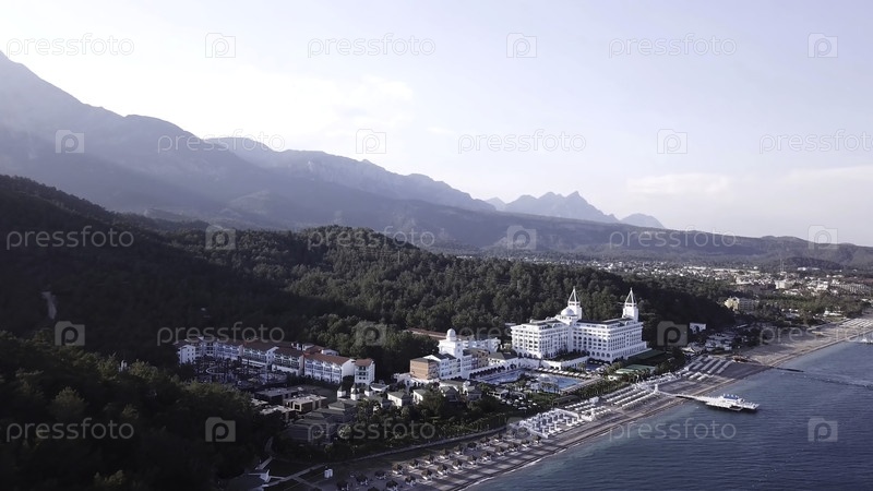 Видео. Вид с воздуха отеля на берегу моря и горы, покрытые зеленым лесом, деревьями с голубым небом на рассвете