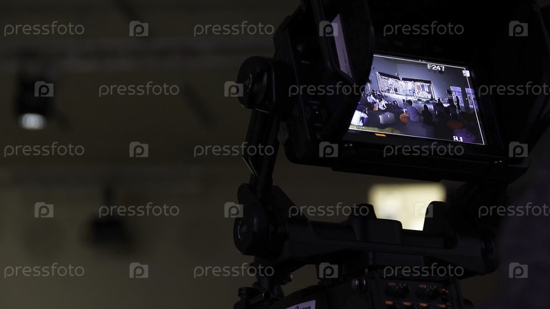 За кулисами телевизионного фильма, съемки съемочной группы и освещение камер установлены в большой студии. Профессиональные цифровые камеры в студии. Оператор работает с диктором на эфирном телевидении