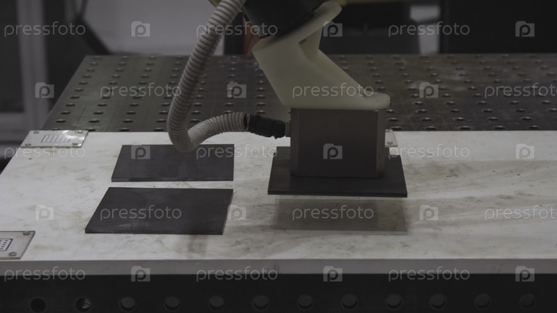 Роботизированная ручная машина на промышленном заводе.Работическая рука использует магнит для транспортировки металлических листов.Промышленность, концепция роботов.Робот-рука умно работает в производственном отделе будущего завода