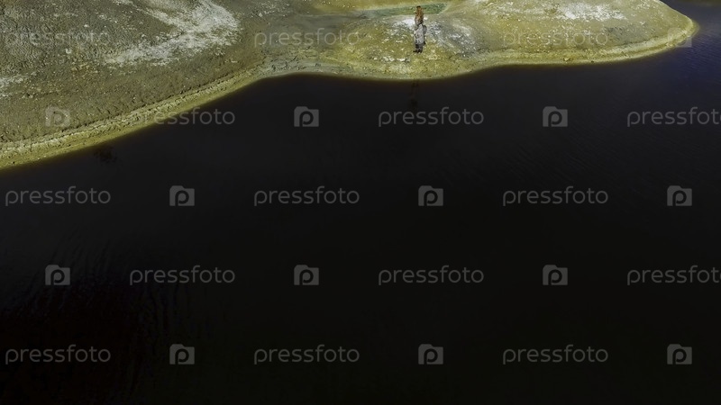 Вид девушки с воздуха проходит через горную местность, природный пейзаж на фоне озера. Кадры. Женщина-путешественница поднимается по горам к вершине синего озера с видом на воздух Travel Lifestyle Adventure Concept