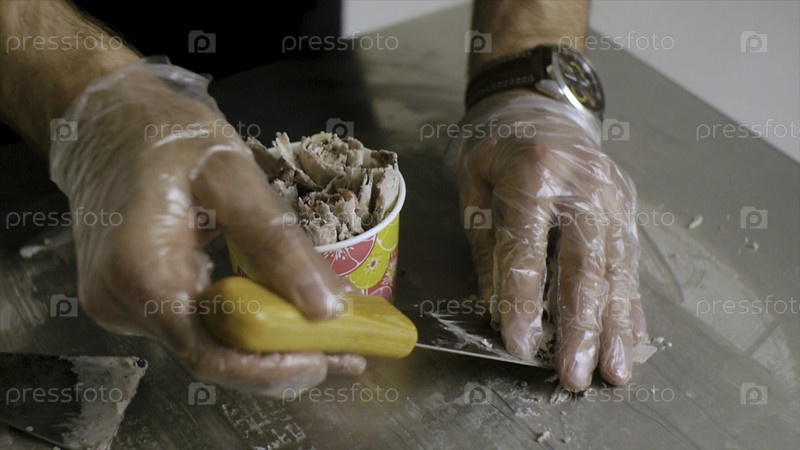 Фруктовое мороженое изолировано. Клип. Вид сверху. Таиландское мороженое - фантастический десерт. Мороженные магазины, накрытые всевозможными ингредиентами. Жареное тайское мороженое в Тайланде