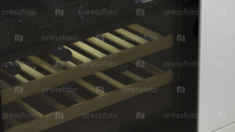 Хранение бутылок вина в холодильнике для охлаждения и сохранения вина. Бытовая техника. Рядом с мужчиной, демонстрирующим домашнее использование винного хладагента в магазине бытовой техники
