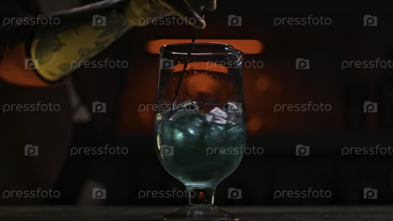 Закрытый бармен перемешивает ледяной коктейль ложкой. резервные кадры. Красивое смешение цветного напитка с льдом на темном неоновом фоне