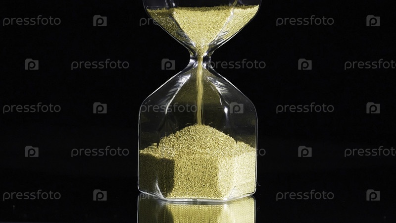 Закрытие золотистого песка. Резервные кадры. Стильные шестиугольные песочные часы со падающими золотыми пятнами на черном изолированном фоне. Прохождение времени и значение каждого зерна