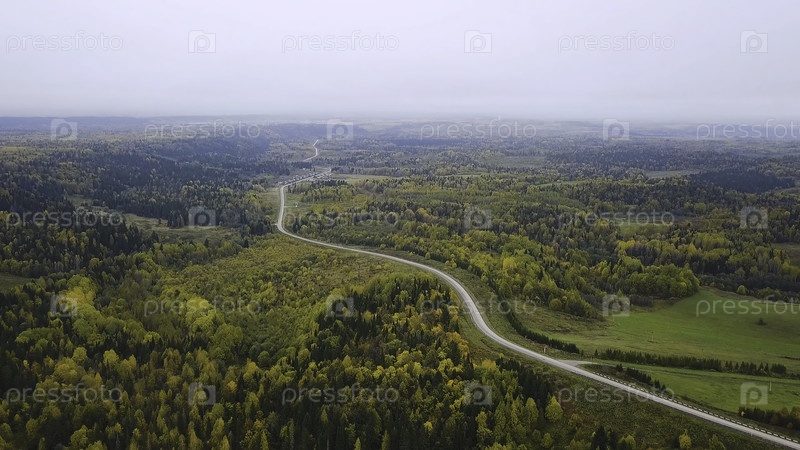 Вид с воздуха обширной лесной равнины и автомобилей, которые ездят по шоссе. Клип. Дорога в осенние лесовоздушные выступления