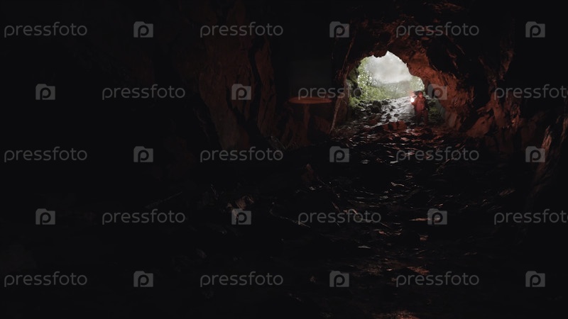 Человек, спускающийся в пещеру оставляет за собой вход, экстремальную и спортивную концепцию.Турист в подземной пещере с красной вспышкой