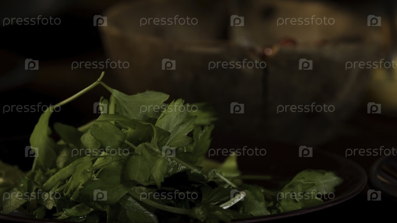 Свежий петрушка лежит на столе рядом со старой деревянной миской. резервные кадры. Закройте руку человека, когда вы берете кусок зеленых листьев во время приготовления пищи