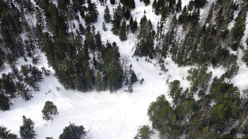 Люди катаются на сноуборде по заснеженному склону зимнего леса, вид с воздуха. Вид зимних каникул в живописном сосновом лесу