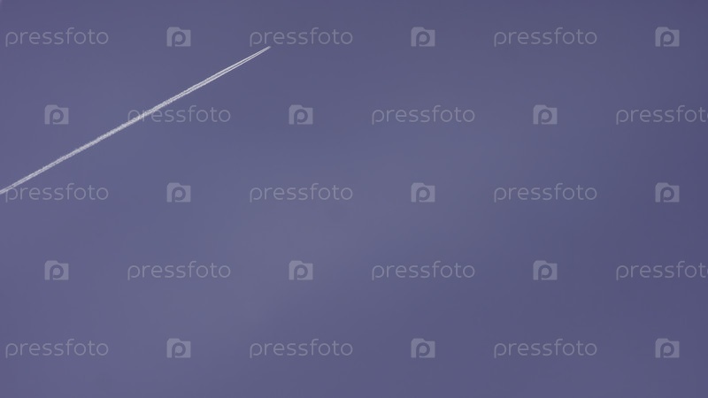 Большой пассажирский сверхзвуковой самолет летит высоко по чистому голубому небу, оставляя длинный белый след. Самолёт летает в белых облаках на синем небе