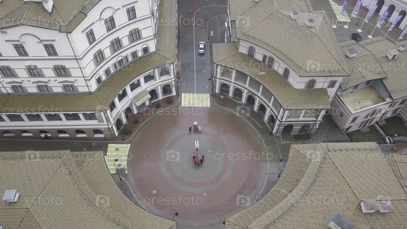 Воздух европейского города с красивыми зданиями в туманное утро. резервные кадры. вид на необычный архитектурный ансамбль домов, построенных в круге