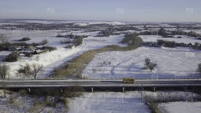 Зимний пейзаж с деревянными домами, дорогой и движущимся желтым автобусом