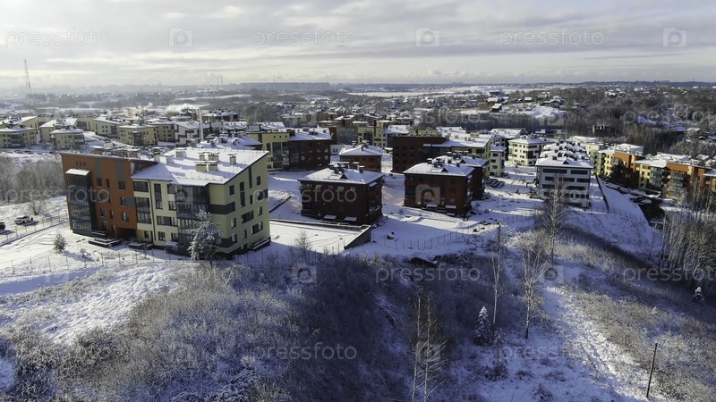 Вид на город зимой со снегом на крышах в солнечный день. Движение. Прекрасный солнечный день в городе зимой