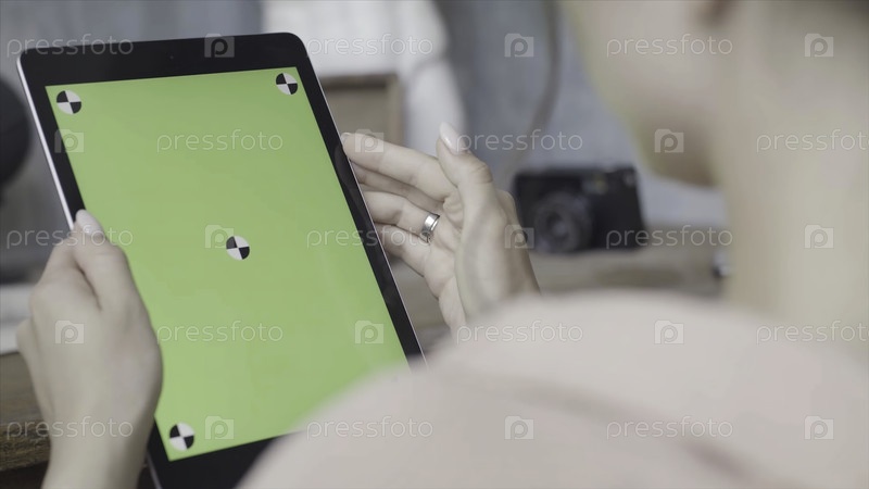 Боковое изображение женщины, держащей планшетный компьютер с зеленым экраном на деревянном столе. резервные записи. Закройте девушку с iPad хромным ключом