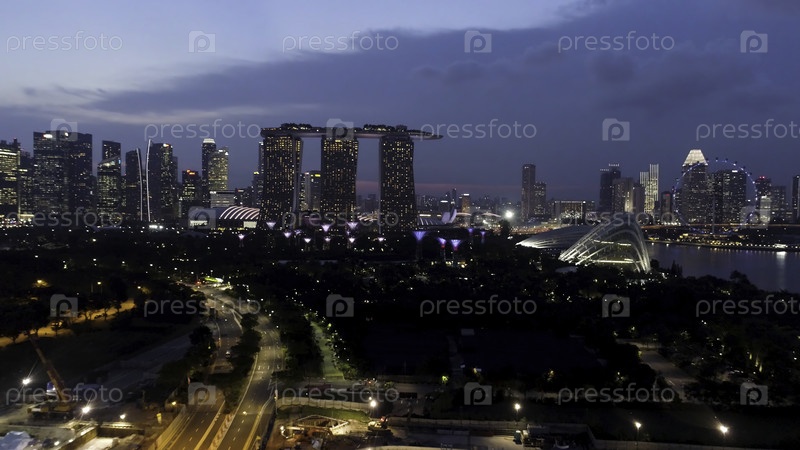 Сингапур - 25 сентября 2018: Сингапурский горизонт и река ночью с известными песками Марина-Бэй, колесом обозрения и другими городскими зданиями. Съемки. ландшафт сингапурского бизнес-сооружения вокруг Marina Bay