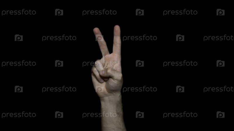 Рука, показывающая победу, поет на черном фоне.Дай знак мира или победы или борьбы