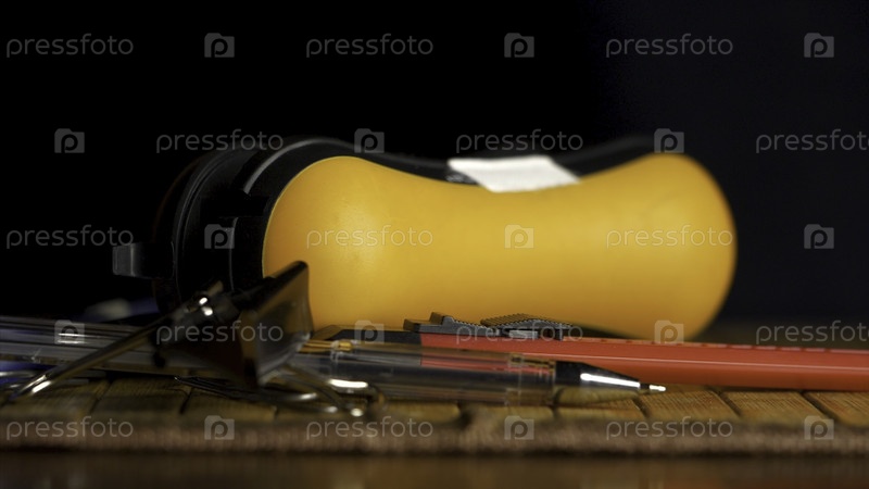 Офис находится на черном фоне. сцепщик, бумажная застежка, ручка, кабинет, офис изолированы на чёрном фоне. перо, карандаш, линейка, сцепник, нож для канцелярских принадлежностей и бумага-застежки изолированы на черном фоне