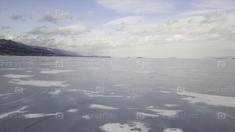 Потрясающий взгляд с воздуха на замерзшее Байкальское озеро, Сибирь, Россия.Клип.Летание по голубому льду водохранилища в горах и синего облачного фона неба