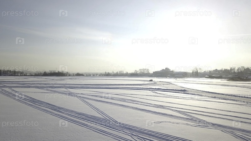Автомобили едут вдоль изогнутой ледяной тропы на снежном озере зимнего вечера во время захода солнца. Вид с воздуха. Один автомобиль проезжает через зимний лес по сельской дороге. вид сверху из дрона