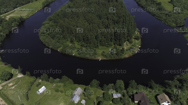 Полет над деревянными домами на берегу реки.Стрельба.Вид с воздуха маленькой деревушки и изогнутой узкой реки, изгибающейся вокруг зеленого лесистого крошечного острова