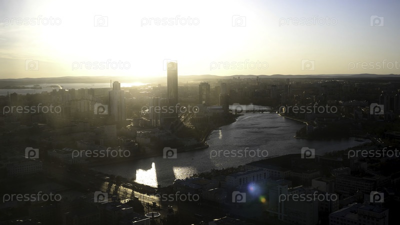Вид с воздуха на красочный закат солнца над Екатеринбургом, Россия. Съемки. Набережная центрального пруда и исторический центр уральского города