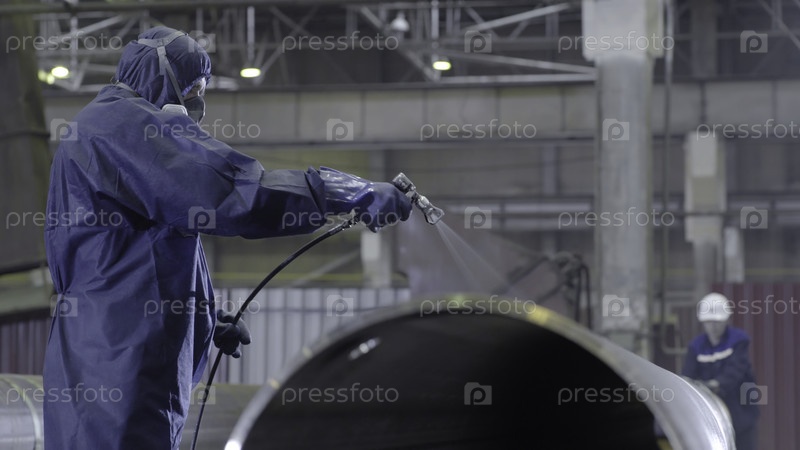 Мужчина держит пистолет и окрашенную сталь, мужчина рисует трубный атомизатор