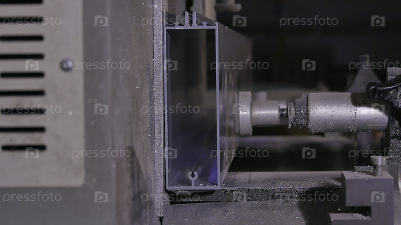 Производство нового витража с использованием специального оборудования или машины. нажимается в прессовую стойку, металлическая или алюминиевая круглая пила плавно разрезает и летящие обломки. маятниковая электросхема для резки металлов,