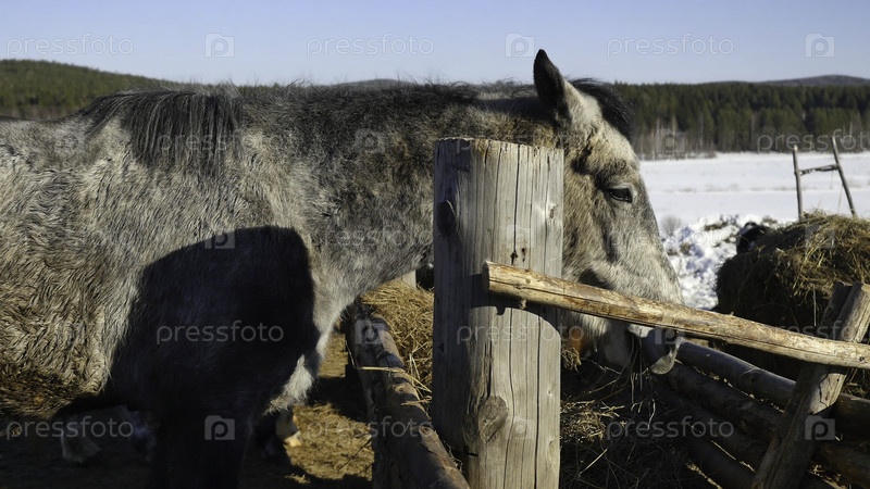 Хорошо ухоженная красивая сильная лошадь жевает сено
