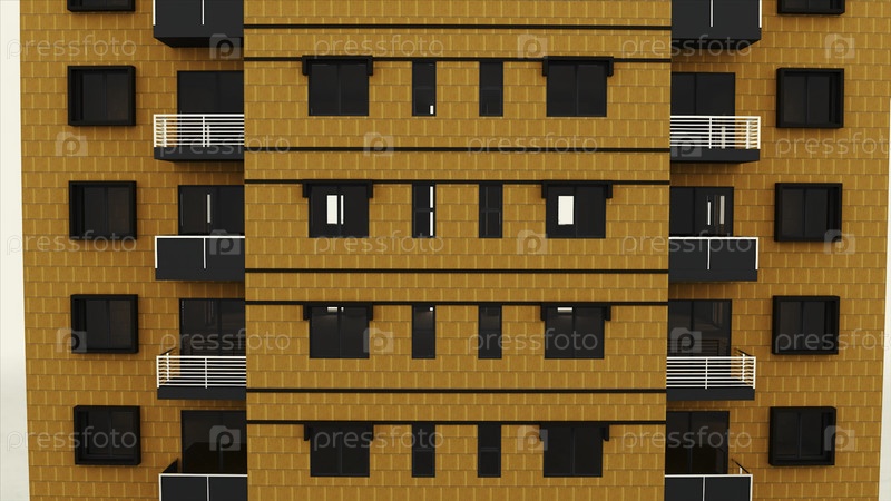 Абстрактный фасад жилого многоэтажного дома изолирован на белом фоне.Анимированная 3D-модель многоэтажного здания